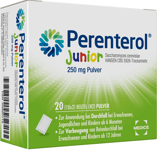 Perenterol® Junior 250 mg Pulver konnte sich zur Selbstmedikation gegen akuten Durchfall bei Kindern ab 2 Jahren bewähren. Nach Rücksprache mit einem Arzt kann Perenterol® Junior 250 mg Pulver sogar bereits bei Babies ab 6 Monaten verwendet werden. Dafür können Sie ein- bis zweimal am Tag einen Beutel Perenterol® Junior in Getränke oder alternativ in eine Speise mischen. Auch bei Reisedurchfällen oder Durchfällen aufgrund der Einnahme von Antibiotika können Kinder Perenterol® Junior 250 mg Pulver einnehmen. Ab einem Alter von 12 Jahren können Kinder und Erwachsene das Mittel außerdem zur Vorbeugung von Reisedurchfall verwenden. Dafür empfiehlt es sich, bereits 5 Tage vor Antritt der Reise ein- bis zweimal täglich einen Beutel Perenterol® Junior aufzulösen und einzunehmen.