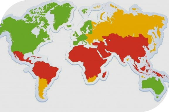 Experten unterscheiden verschiedene Regionen auf der Welt hinsichtlich eines hohen, mittleren und niedrigen Risikos für Reisediarrhö (siehe Karte)1: